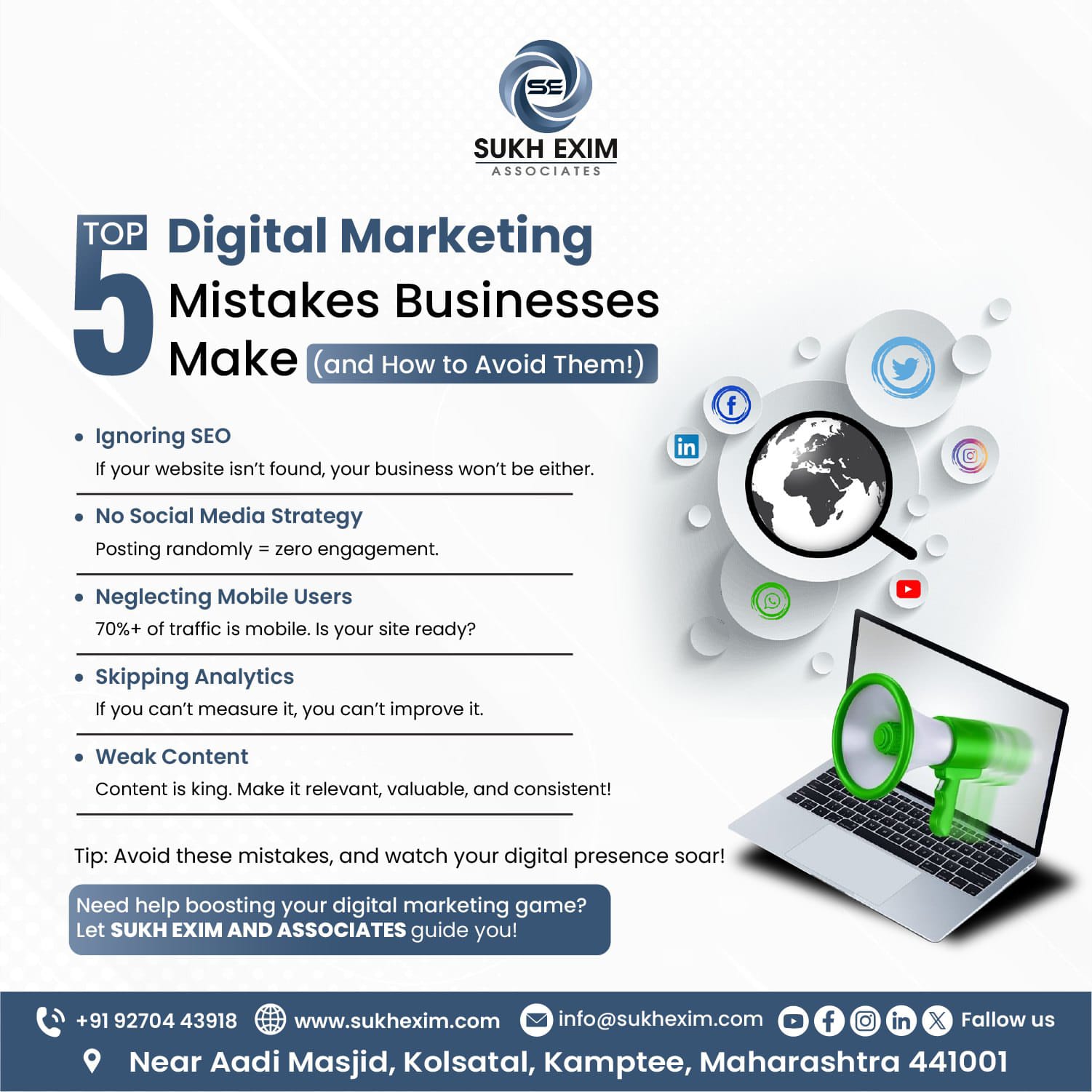 At Sukh Exim & Associates Pvt. Ltd., we help businesses grow with smart digital marketing and reliable support services. Our team handles SEO services, social media marketing, Google Ads, Facebook Ads, and Instagram Ads to boost your brand visibility and reach the right audience. We also design clean, professional graphics that reflect your brand identity. Along with marketing, we offer accurate accounting and bookkeeping services to keep your finances organised. Whether you're starting out or scaling up, we work closely with you to understand your goals and deliver results that truly matter.